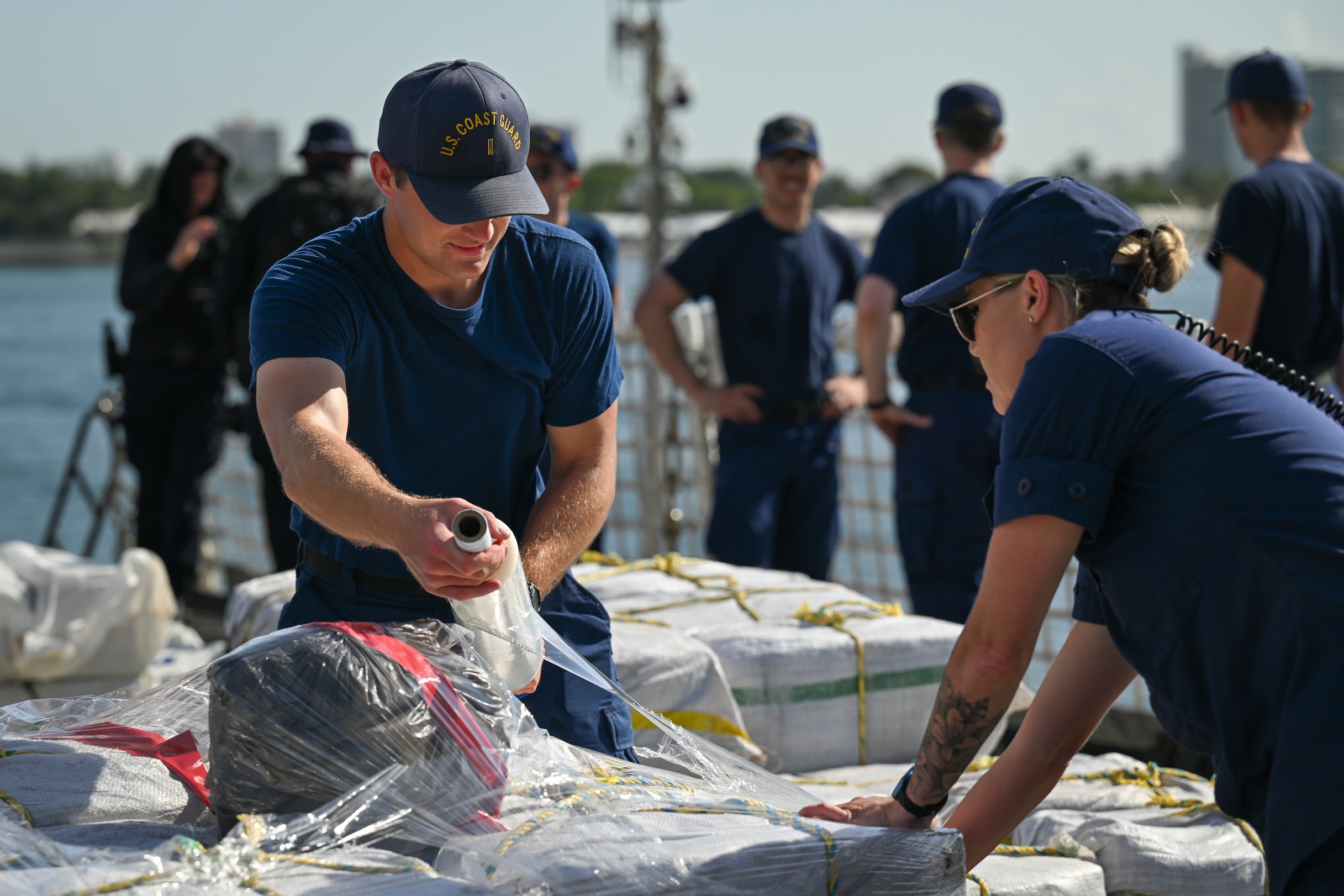 Crew members aboard U.S. Coast Guard Cutter Calhoun (WMSL 759) wraps a pallet of illegal narcotics in Port Everglades, May 16, 2025. Calhoun’s crew offloaded more than 19,055 pounds of cocaine and marijuana valued at approximately $140.9 million in Port Everglades, May 16, 2025. (Coast Guard photo by Petty Officer 3rd Class Jessica Walker)