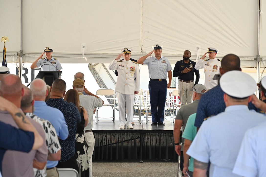 During Coast Guard Cutter Valiant's (WMEC 621) heritage recognition ceremony, the official party and crowd stand for the national anthem in Jacksonville, Florida, June 17, 2024. The cutter was honored after more than 57 years of service in front of Coast Guard and cutter leadership, the assembled crew and former crew members, family and friends. (U.S. Coast Guard photo by Petty Officer 2nd Class Brandon Hillard)