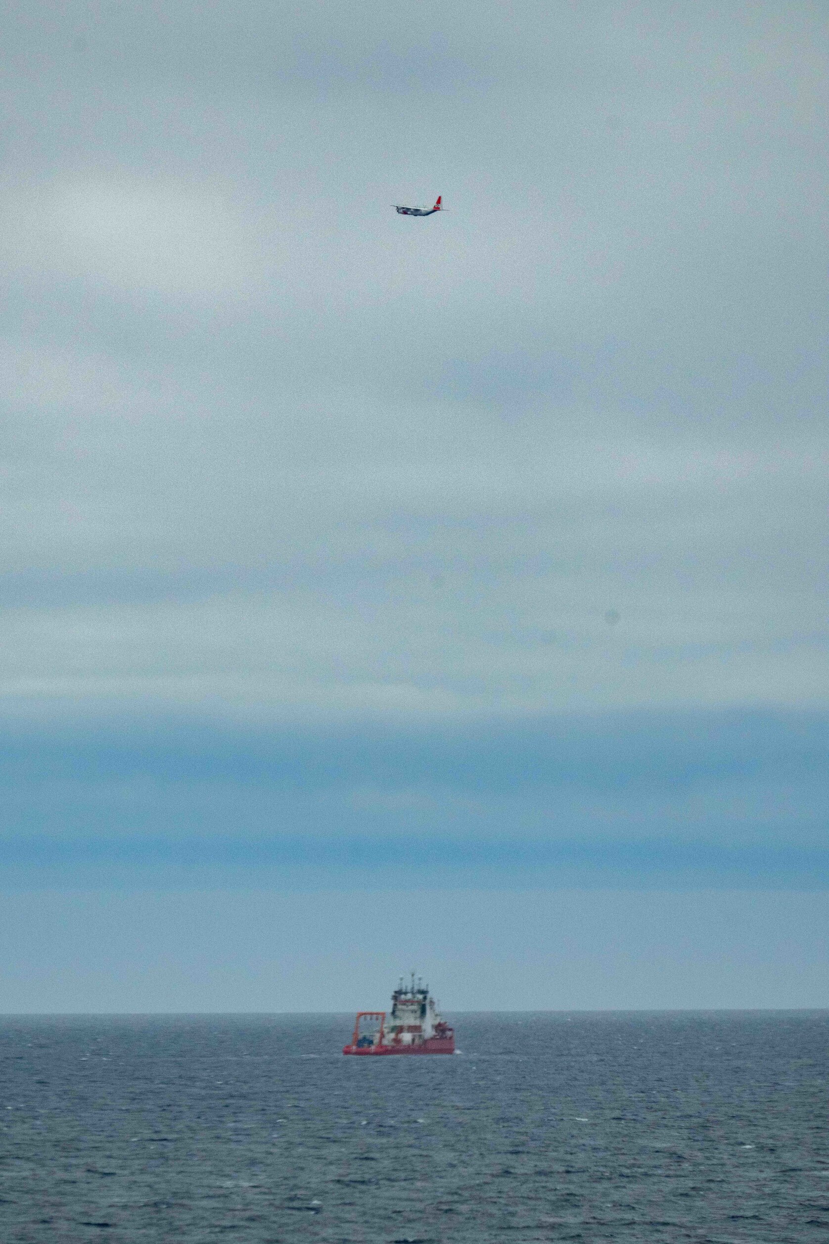 An HC-130J Hercules fixed wing aircraft from Air Station Kodiak flies over the Liberia-flagged Chinese research ship, Zhong Shan Da Xue Ji Di, over the delineated U.S. Extended Continental Shelf, approximately 230 miles north of Utqiagvik, Alaska, Aug. 31, 2025. The Coast Guard is the only U.S. surface presence in the Arctic and works in conjunction with U.S. Northern Command and Alaskan Command to constantly monitor foreign vessels operating in and near U.S. waters in support of U.S. homeland defense and security operations. (U.S. Coast Guard photo)