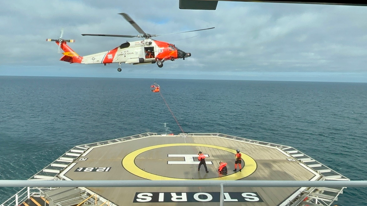Crewmembers from the Coast Guard Cutter Storis (WAGB 21) conduct helicopter operations with an MH60-Jayhawk helicopter air crew from Coast Guard Air Station Kodiak, Alaska, while underway in the Gulf of Alaska, Aug. 20, 2025. The Coast Guard is the only U.S. surface presence in the Arctic and works in conjunction with U.S. Northern Command and Alaskan Command to constantly monitor foreign vessels operating in and near U.S. waters in support of U.S. homeland defense and security operations. (U.S. Coast Guard photo)