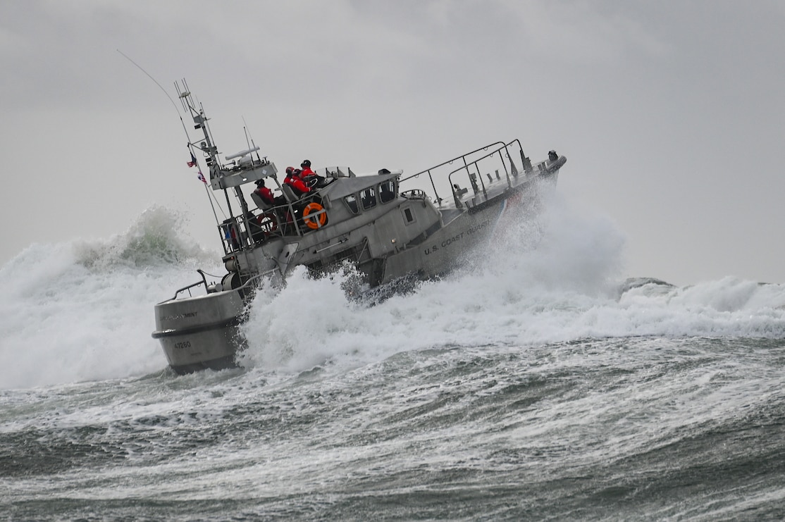 A crew aboard a 47-foot Motor Lifeboat from Coast Guard Station Cape Disappointment enters the surf off the Washington Coast near the North Head Lighthouse on Jan. 21, 2023. Members from Station Cape Disappointment regularly train during the winter months when offshore weather conditions usually provide an ideal environment for surf training. (U.S. Coast Guard photo by Petty Officer Steve Strohmaier)