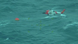 A U.S. Coast Guard MH-60 Jayhawk helicopter crew from Air Station Elizabeth City rescued five individuals from a life raft after their sailboat, Magic Bus, began taking on water 260 nautical miles offshore Cape Hatteras, N.C., Thursday, Oct. 26, 2023. The Coast Guard coordinated with the aircraft carrier USS George H.W. Bush for refueling support during the long-distance rescue. All five individuals were recovered in good health and transported safely to Air Station Elizabeth City. (U.S. Coast Guard photo by Air Station Elizabeth City)