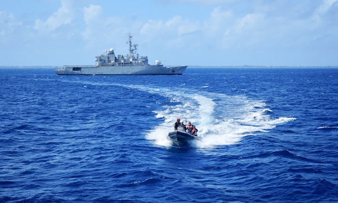 On March 22, 2025, the USCGC Frederick Hatch (WPC 1143) boarding team return from the Prairial aboard the French small boat following a simulated Western and Central Pacific Fisheries Commission (WCPFC) inspection and tabletop discussion on illegal, unreported, and unregulated fishing (IUUF) meeting international security objectives with a key partner in the region. The USCGC Frederick Hatch (WPC 1143) and the Marine Nationale (French Navy) frigate FS Prairial (F731) crews conducted a passing exercise in Majuro Atoll’s lagoon. (U.S. Coast Guard photo)