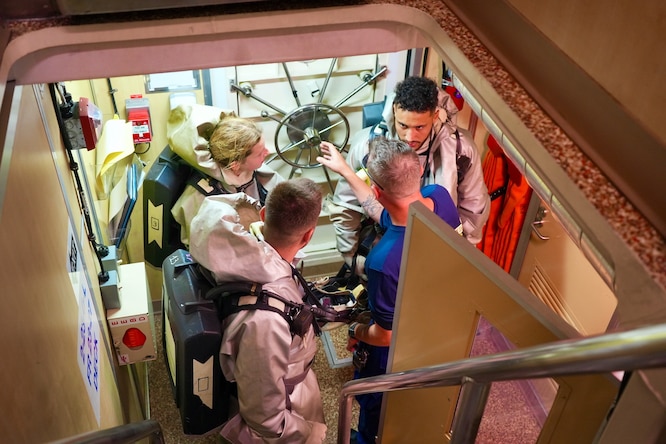 On March 22, 2025, the USCGC Frederick Hatch (WPC 1143) and the Marine Nationale, the French Navy, frigate FS Prairial (F731) crews conduct a passing exercise in Majuro Atoll’s lagoon. During the exercise, Prairial’s firefighting team responded to a simulated alpha fire aboard Frederick Hatch, fulfilling their annual rescue and assistance drill requirement. (U.S. Coast Guard photo)