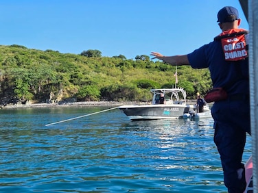 A Coast Guad Boat Forces Unit U.S. Virgin Islands surface unit is on-scene with the recreational vessel Aquarius during the vessel Cool Change grounding response in the vicinity of Christmas Cove, St. Thomas, U.S. Virgin Islands, Nov. 20, 2025. The vessel Aquarius rescued the Cool Change vessel captain, who was the sole person aboard the vessel. No injuries were reported in this case. (U.S. Coast Guard photo).