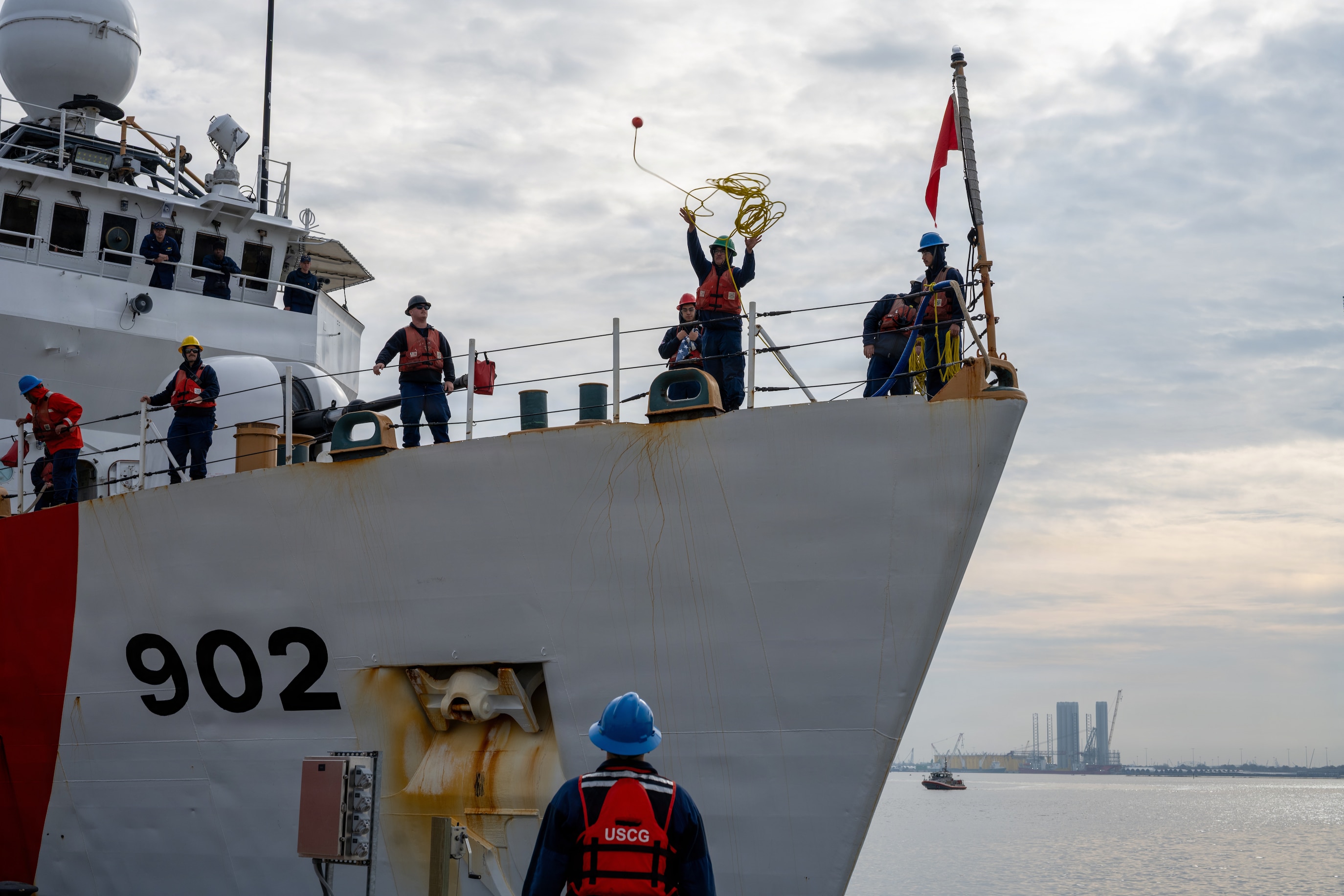 Coast Guard crewmembers assigned to Coast Guard Cutter Tampa (WMEC 902) perform special sea detail evolutions as the cutter returns to homeport in Portsmouth, Virginia, on Nov. 21, 2025. Tampa’s crew deployed in support of counterdrug operations in the Eastern Pacific. (U.S. Coast Guard photo by Petty Officer 3rd Class Mason Svitenko)