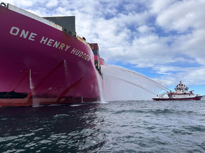 Los Angeles Fire Department fireboats are continuing firefighting operations to stop fire aboard cargo vessel One Henry Hudson off the Port of Los Angeles, Nov. 22, 2025. A unified command was established consisting of Los Angeles Fire Department, Coast Guard, L.A. Port Police was stood up to respond to this incident, when the fire started Friday night. (U.S. Coast Guard Photo by Petty Officer 1st Class Kody Sparks)