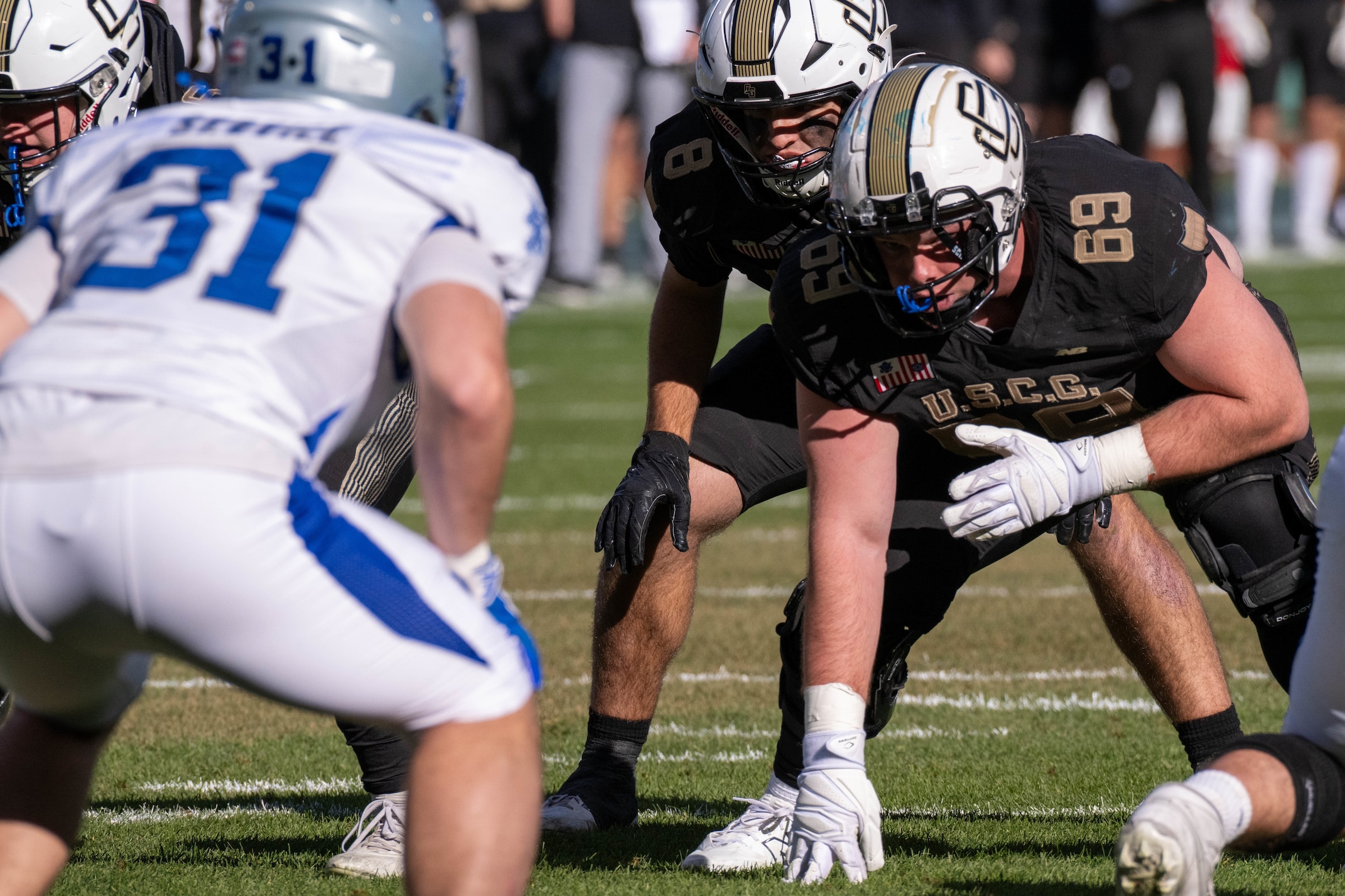 U.S. Coast Guard Academy football players face U.S. Merchant Marine Academy football players on the defensive line during the 54th Secretaries’ Cup at Fenway Park, Boston, Nov. 15, 2025. In 2003, “Secretary’s Cup” was pluralized when the U.S. Coast Guard moved to the Department of Homeland Security. (U.S. Coast Guard photo by Petty Officer Third Class Leo Avila.)