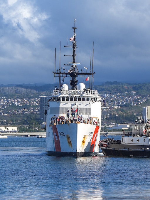 U.S. Coast Guardsmen assigned to the medium endurance cutter USCGC Harriet Lane (WMEC 903) prepare to moor at Joint Base Pearl Harbor-Hickam in Honolulu Oct. 6, 2025. During their 81-day deployment, the crew patrolled more than 16,000 nautical miles, conducting joint operations and territorial integrity missions across Oceania. (U.S. Coast Guard photo by Petty Officer 3rd Class Jennifer Nilson)
