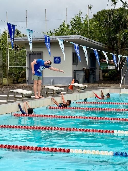Ensign Sean Lyman, of the USCGC Myrtle Hazard (WPC 1139) crew, gives swim lessons to local children in Pohnpei on Dec. 1, 2025, during community engagements that deepen ties through sport. The crew returned home Dec. 14, 2025, after completing a successful expeditionary patrol under Operation Blue Pacific, deepening partnerships with Pacific nations and bolstering maritime security in the region. The Sentinel-class fast response cutter crew operated for over 500 hours, patrolling 5,380 nautical miles from Nov. 17 to Dec. 14, with 15 days dedicated to providing a persistent presence in the exclusive economic zones of the Federated States of Micronesia and the Republic of Palau, as well as on the high seas. (U.S. Coast Guard photo)