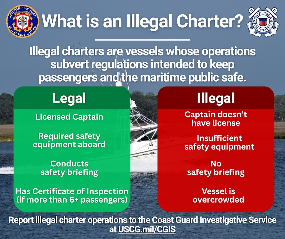 Coast Guard and local law enforcement crews will be on the lookout for illegal passenger for hire vessel operations in the San Juan Harbor during the San Sebastián Festival from Jan. 15 to 28, 2026. Only a captain licensed by the Coast Guard can transport passengers for hire and must do so in a vessel that has the proper lifesaving equipment onboard. Vessel operators who carry passengers for hire without the proper license face the termination of the voyage and possible fines that may range from $500 to a maximum of $117,608. (U.S. Coast Guard graphic)
