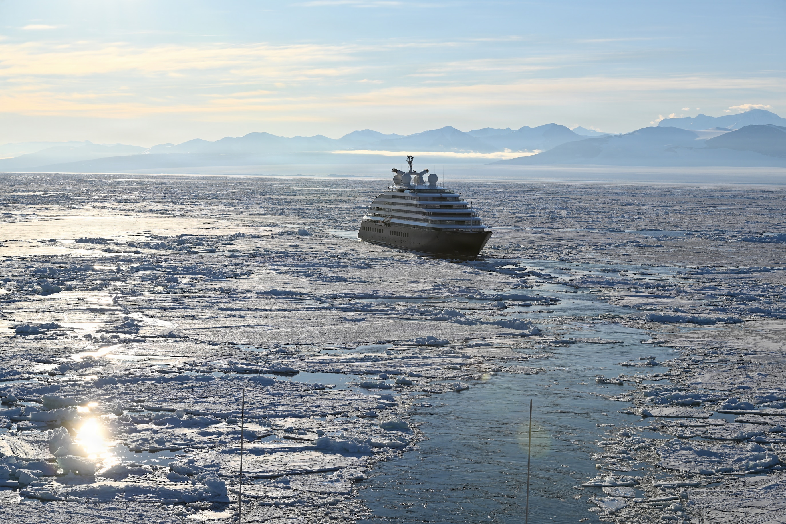 USCGC Polar Star (WAGB 10) escorts an Australian-owned cruise ship out of pack ice in the Ross Sea after the vessel requested assistance amid Operation Deep Freeze 2026, Jan. 17, 2026. Pacific Air Forces operates on a 24-hour basis to provide the U.S. National Science Foundation complete joint operational and logistic support for Operation Deep Freeze. (U.S. Coast Guard photo by Petty Officer 2nd Class Christopher Bokum)