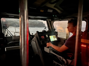U.S. Coast Guard Petty Officer 2nd Class Johnathan Simmons, a coxswain assigned to Coast Guard Station Kauai in Lihue, Hawaii, maneuvers a Station Kauai 45-foot Response Boat-Medium while conducting search patterns during a search and rescue case off the north shore of Kauai Jan. 28, 2026. Coast Guard and agency partners are searching for a man in the water who was last seen fishing on the rocks near Kilauea, Hawaii. (U.S. Coast Guard photo, courtesy Station Kauai)