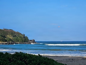 A Coast Guard Air Station Barbers Point MH-65 Dolphin helicopter crew and USCGC Oliver Berry (WPC 1124) crew conduct search patterns off the north shore of Kauai Jan. 28, 2026. Coast Guard and agency partners are searching for a man in the water who was swept off the rocks while fishing near Kahili Beach. (U.S. Coast Guard photo, courtesy Station Kauai)