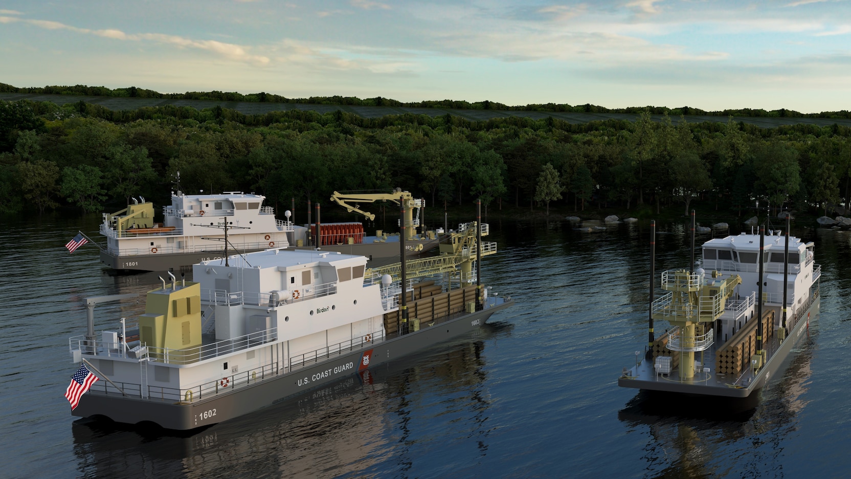 A rendering of the future U.S. Coast Guard Waterways Commerce Cutters Allen Thiele, Fred Permenter, and Samuel Wilson. The new "Chief Petty Officer Class" cutters will honor the legacy of senior enlisted leaders and strengthen the Coast Guard’s inland fleet capabilities. (U.S. Coast Guard courtesy rendering Birdon Group)