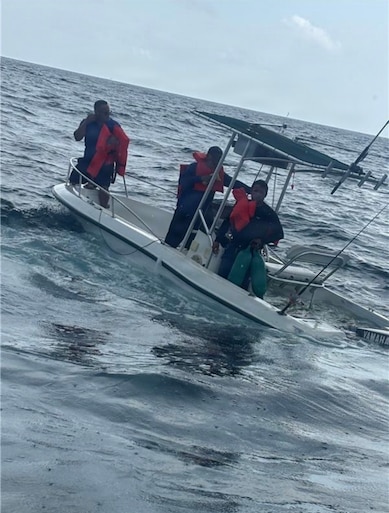 A U.S. Coast Guard Station Miami Beach boat crew arrived on scene with a vessel taking on water near Virginia Key, Florida, March 13, 2026. The boat crew transported the three individuals to Crandon Park Marina with no injuries reported. (U.S. Coast Guard courtesy photo)