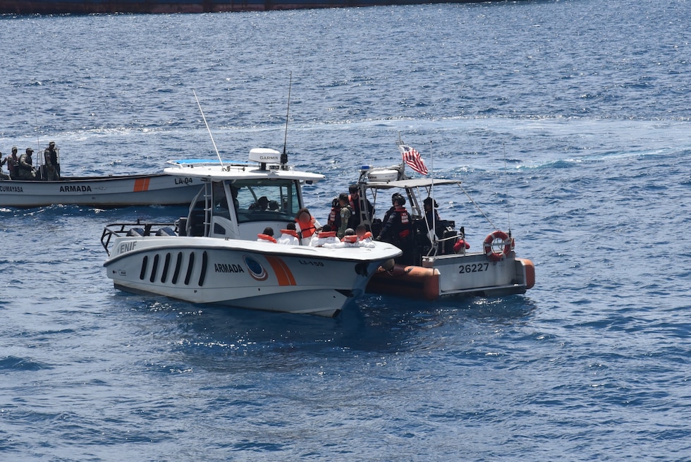 Coast Guard Cutter Thetis crewmembers repatriate 60 migrants to Santo Domingo, Dominican Republic, March 30, 2026. The Thetis and a Customs and Border Protection aircrew interdicted an unlawful migration voyage vessel transporting 54 Haitians and six Dominican Republic nationals in Mona Passage waters off Puerto Rico, March 27, 2026. (U.S. Coast Guard photo)