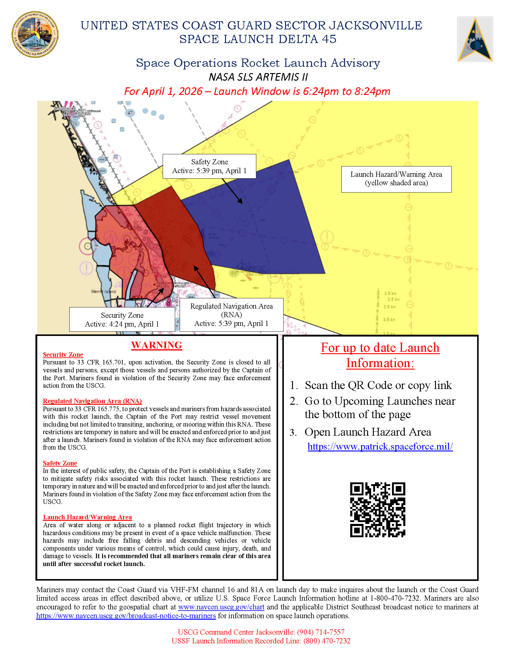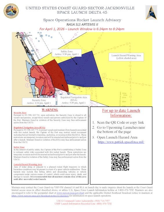 Coast Guard crews are scheduled to apply and enforce limited access areas for NASA’s Artemis II launch at the Kennedy Space Center in Cape Canaveral, Florida, April 1, 2026. The Coast Guard’s limited access areas include a security zone, regulated navigation area and a safety zone, which are in place to mitigate safety risks to the maritime public and to protect launch infrastructure. (U.S. Coast Guard photo)