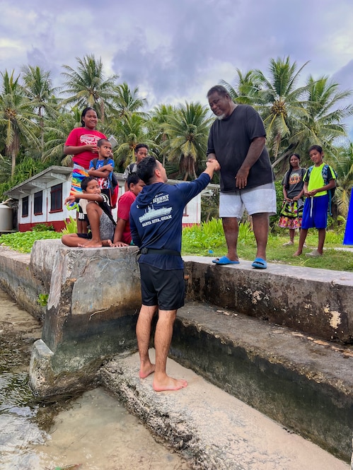 Lt. Ray Cerrato, commanding officer of USCGC Oliver Henry (WPC 1140), greets the leaders and residents of Kuttu, Federated States of Micronesia, on March 18, 2026, during a visit to support an FSM government request to deliver supplies and capture imagery of a vessel grounded in 1998. The crew of the USCGC Oliver Henry (WPC 1140) returned to Guam on March 29, 2026, closing out a 29-day patrol period that restored a critical tsunami early warning station to a remote Pacific atoll, delivered humanitarian supplies to two island communities, and enforced fisheries laws across more than 4,000 nautical miles. (U.S. Coast Guard photo)
