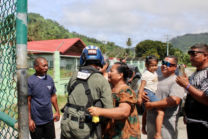 U.S. Coast Guard Petty Officer 3rd Class James Warguez is embraced by members of a family rescued by the crew of Legend-class cutter USCGC Midgett (WMSL 757) in the waters of Chuuk State, Federated States of Micronesia, after being reunited with loved ones upon their safe return via U.S. Coast Guard MH-65 Dolphin helicopter to Weno, Chuuk State on April 6, 2026. The crew of Midgett rescued the family on April 6 after their 23-foot single-outboard skiff vessel went missing a week earlier in the waters of Chuuk State. U.S. Coast Guard missions in the Indo-Pacific focus on issues that directly support and advance our regional partners’ efforts to protect fish stocks and ensure the safety of life at sea, helping to ensure a secure and prosperous Indo-Pacific. (U.S. Coast Guard photo by Lt. Doug Brown)