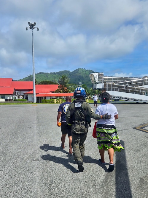 U.S. Coast Guard Petty Officer 3rd Class James Warguez, an aviation maintenance technician assigned to Air Station Barbers Point, escorts members of a local family from a U.S. Coast Guard MH-65 Dolphin helicopter embarked on Legend-class cutter USCGC Midgett (WMSL 757) to reunite with loved ones in Weno, Federated States of Micronesia, on April 6, 2026. The crew of Midgett rescued the family on April 6 after their 23-foot single-outboard skiff vessel went missing a week earlier in the waters of Chuuk State. U.S. Coast Guard missions in the Indo-Pacific focus on issues that directly support and advance our regional partners’ efforts to protect fish stocks and ensure the safety of life at sea, helping to ensure a secure and prosperous Indo-Pacific. (U.S. Coast Guard photo by Lt. Doug Brown)