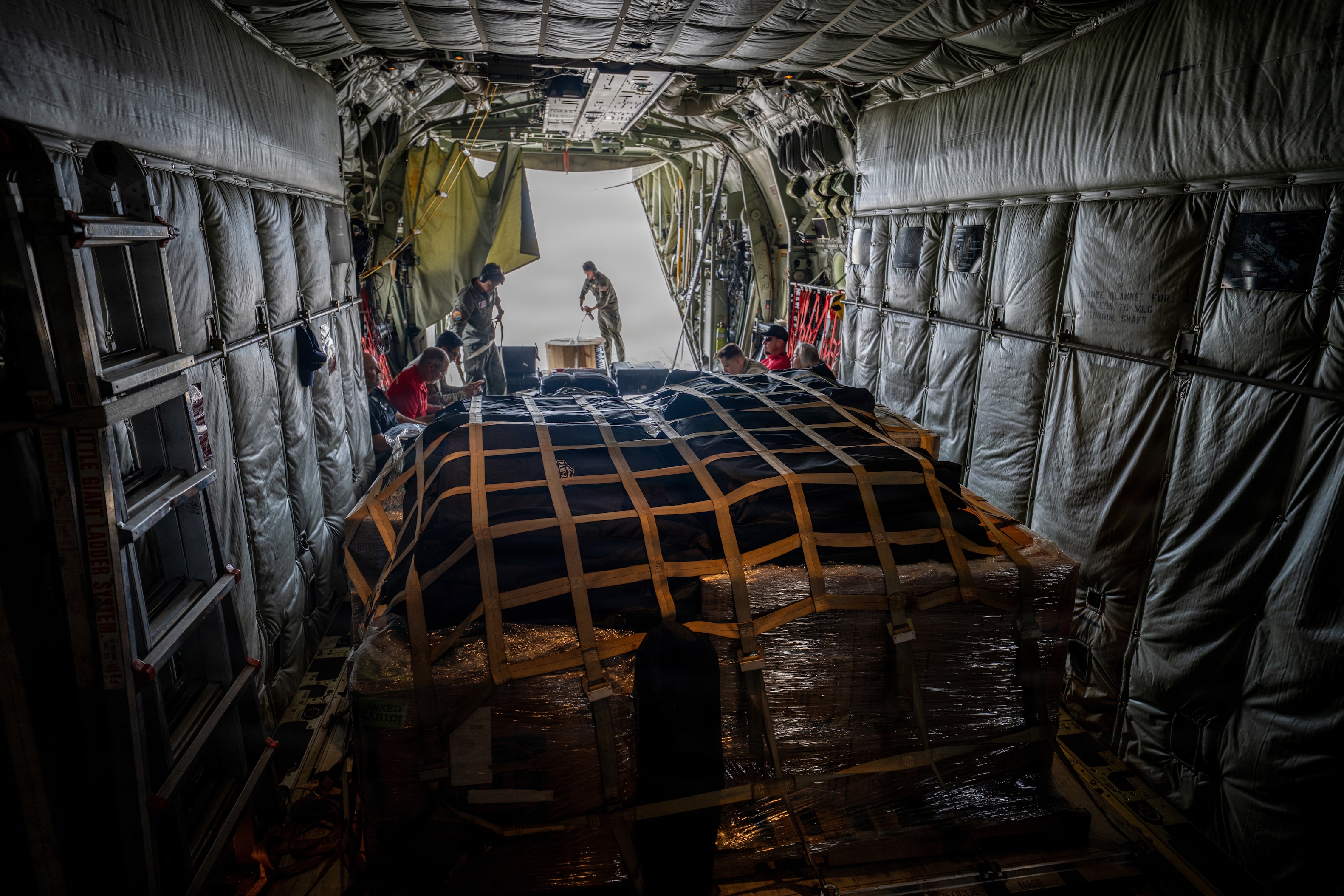 U.S. Coast Guardsmen assigned to a Coast Guard Air Station Barbers Point HC-130 Hercules airplane crew load equipment and supplies onto the airplane at the Antonio B. Won Pat International Airport in Tamuning, Guam, April 17, 2026. Coast Guard aircrews transported personnel with FEMA, the U.S. Army Corps of Engineers, the Department of Public Health and Social Services, and the Department of War to Saipan in support of recovery efforts following Typhoon Sinlaku. (U.S. Coast Guard photo by Chief Petty Officer Corinne Zilnicki)