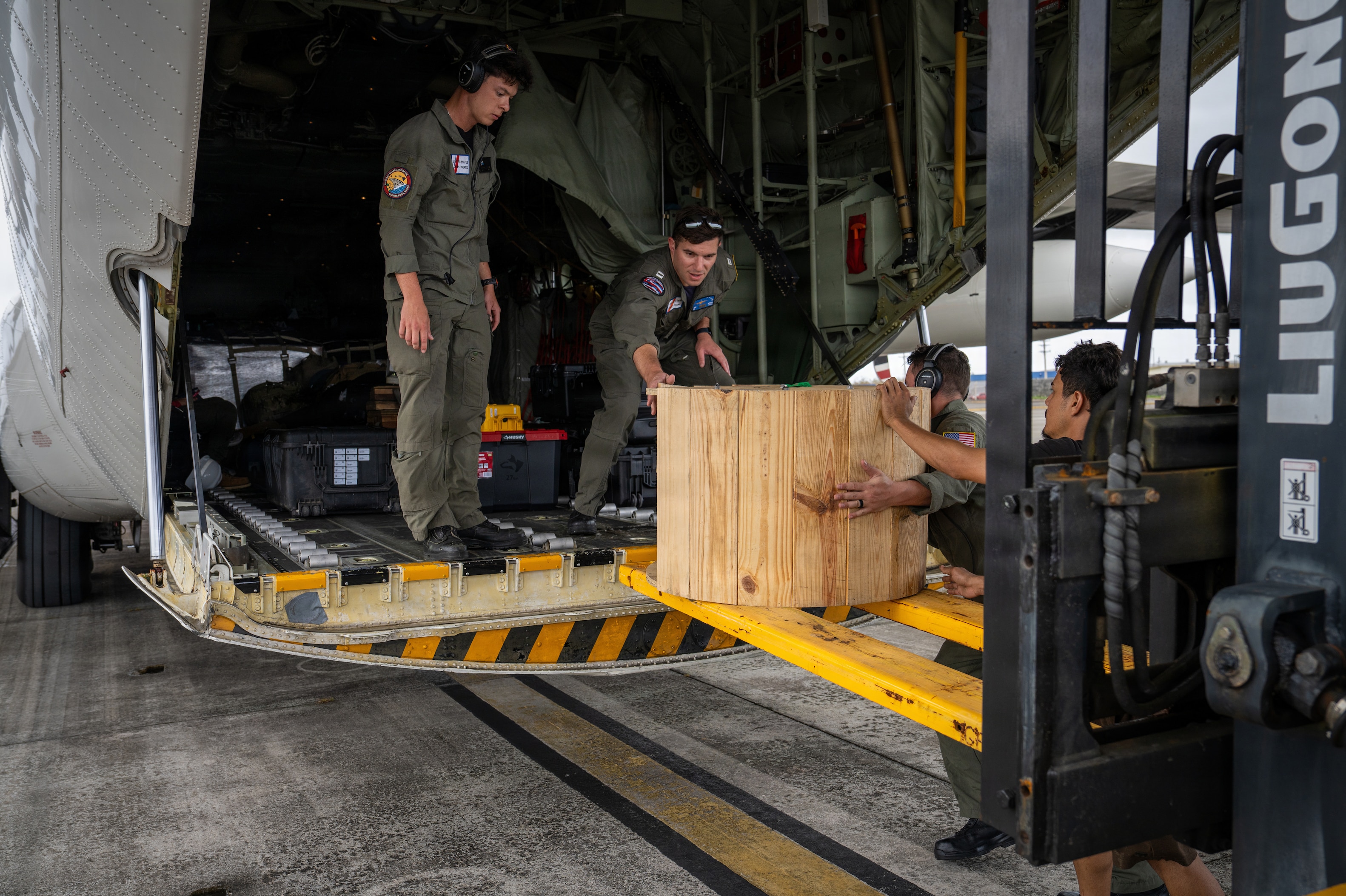 U.S. Coast Guardsmen assigned to a Coast Guard Air Station Barbers Point HC-130 Hercules airplane crew load equipment and supplies onto the airplane at the Antonio B. Won Pat International Airport in Tumining, Guam, April 17, 2026. Coast Guard transported personnel with FEMA, the U.S. Army Corps of Engineers, the Department of Public Health and Social Services, and the Department of War to Saipan in support of recovery efforts following Typhoon Sinlaku. (U.S. Coast Guard photo by Chief Petty Officer Corinne Zilnicki)