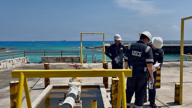 U.S. Coast Guard facility inspectors from U.S. Coast Guard Forces Micronesia/Sector Guam, embarked on U.S. Coast Guard crews aboard a USCGC Oliver Henry (WPC 1140), inspect fuel lines in Rota on April 19, 2026. U.S. Coast Guard crews pressed north on April 19, 2026, ensuring the safety of Apra Harbor before moving toward communities still isolated by the effects of Super Typhoon Sinlaku, launching a coordinated surge to fully reopen ports across Guam and the Commonwealth of the Northern Mariana Islands and deliver resources. (U.S. Coast Guard photo by Ensign Jiaya Wilson)
