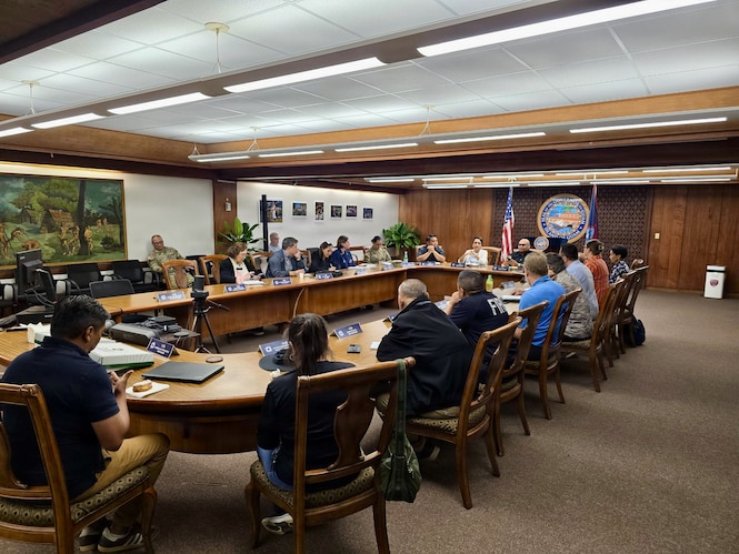 Capt. Jessia Worst, commander of U.S. Coast Guard Forces Micronesia/Sector Guam, provides updates at an island-wide leadership meeting at the Governor's Complex on Guam on April 20, 2026. U.S. Coast Guard crews conitnue work in Guam and pressed north on April 19, 2026, ensuring the safety of Apra Harbor before moving toward communities still isolated by the effects of Super Typhoon Sinlaku, launching a coordinated surge to fully reopen ports across Guam and the Commonwealth of the Northern Mariana Islands and deliver resources. (U.S. Coast Guard photo by Senior Chief Petty Officer Kevin Reilly)