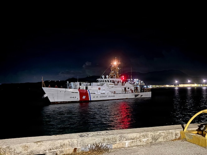 U.S. Coast Guard crews aboard USCGC Frederick Hatch (WPC 1143) return to Guam on April 23, 2026, after supporting the search for six mariners from the cargo vessel Mariana off the Commonwealth of the Northern Mariana Islands and ensuring the transfer of supplies to USCGC Oliver Henry (WPC 1140), who took over the surface asset role in the search. U.S. Coast Guard crews pressed north on April 19, 2026, ensuring the safety of Apra Harbor before moving toward communities still isolated by the effects of Super Typhoon Sinlaku, launching a coordinated surge to fully reopen ports across Guam and the Commonwealth of the Northern Mariana Islands and deliver resources. (U.S. Coast Guard photo by Capt. Jessica Worst)
