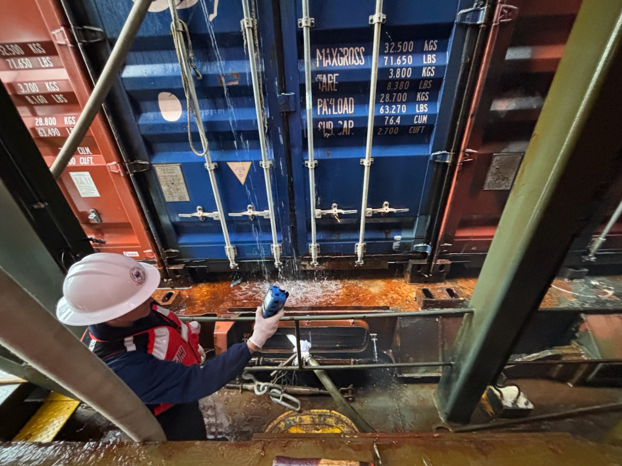 This is a standard operating procedure for most commercial vessels operating in the port. All used firefighting water is being contained inside the cargo hold of the vessel. The used firefighting water inside the vessel will be offloaded under coast guard supervision and transported via barge or truck to a waste reception facility.