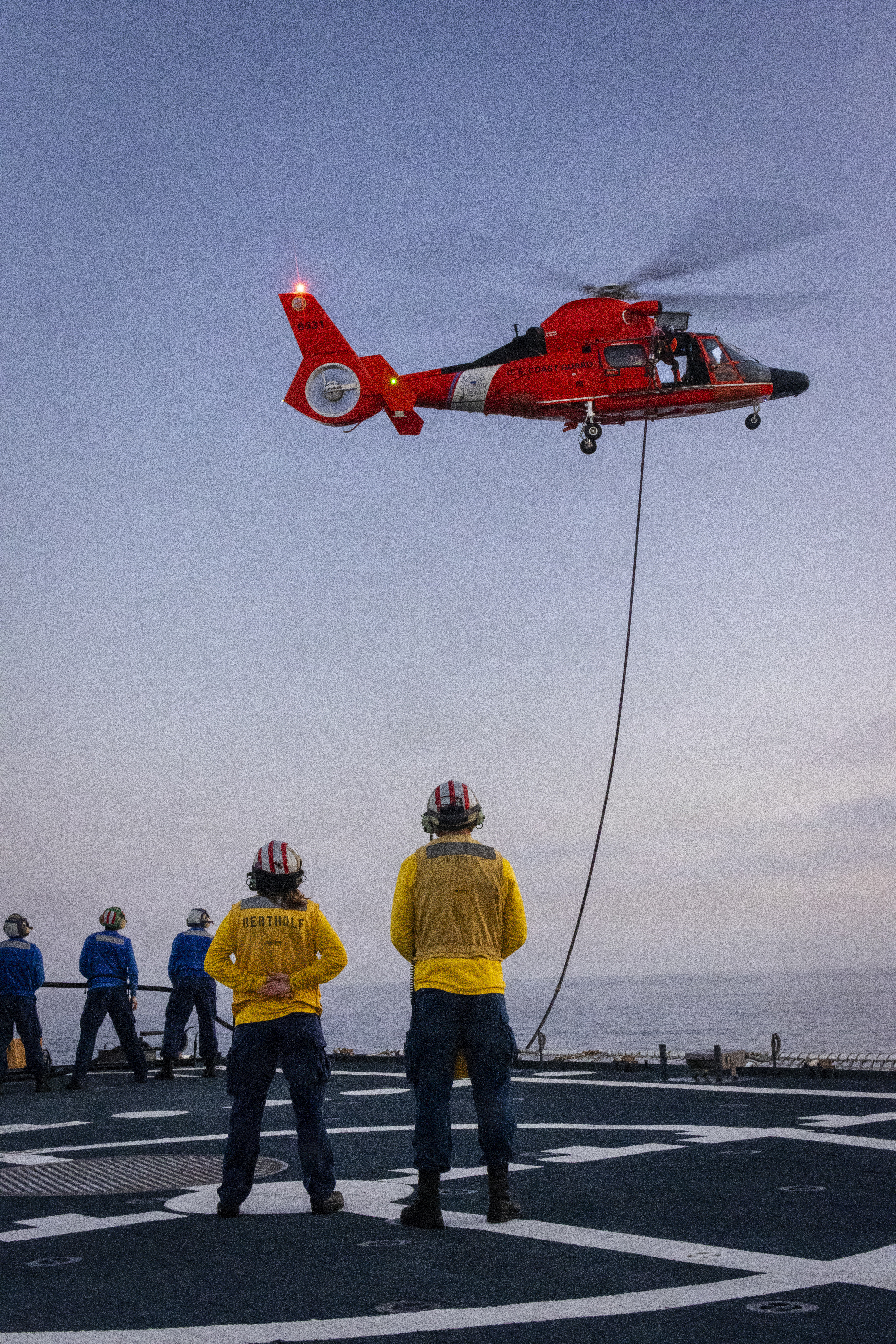 Bertholf’s crew conducted more than 180 flight operations with helicopter aircrews from Air Station San Francisco, Air Station Ventura, and Air Station San Diego, refining proficiency in shipboard landings, in-flight refueling and vertical replenishment. The crew completed more than 120 hours of small boat training, strengthening the capabilities of law enforcement teams and cutter boat pursuit crews. Additionally, Bertholf executed two live-fire gunnery exercises, employing minor caliber weapons as well as major weapon systems including the 57 mm and the Phalanx Close-In Weapons System.