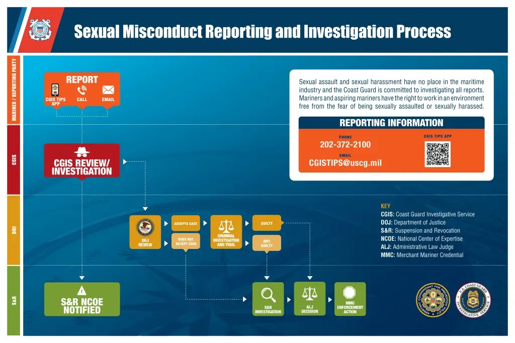 The reporting options include a CGIS Tips App, and/or the email address CGISTIPS@uscg.mil which can be used by all reporting sources, including bystanders and survivors, who have access to a smart phone or the internet. The reports, which can be anonymous or for attribution, are received and reviewed by the Coast Guard Investigative Service (CGIS). An investigation will be initiated for all reports received and someone will provide follow-up communications with all reporting sources who provide contact information. The Coast Guard also maintains a 24/7 watch, which can field reports of sexual misconduct via the National Command Center (NCC) phone number at 202-372-2100. CGIS will leverage all available resources to immediately initiate a criminal investigation for a sexual crime occurring on a U.S. flagged vessel anywhere in the world. The Coast Guard will respond to any reports of sexual misconduct with trained investigators and will hold offenders accountable through criminal prosecution and/or actions against U.S. Coast Guard issued merchant mariner credentials (MMCs).